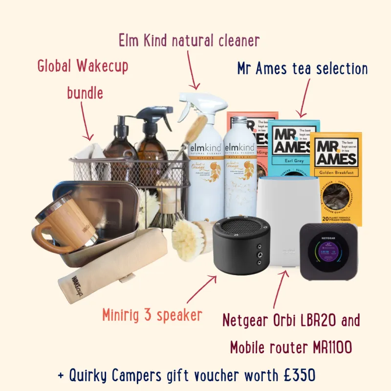 Global WAKEcup goodies for all your working from van comforts including Zero Waste Cutlery Set, Stainless Steel Lunchbox, WAKEcup Travel Mug, Zero Waste Kitchen, Elm Kind Washing Up Liquid & a selection of tea from Mr. Ames
